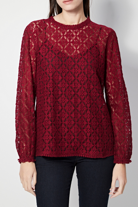 Top en dentelle, Col rond avec galons, Manches longues élastiques.