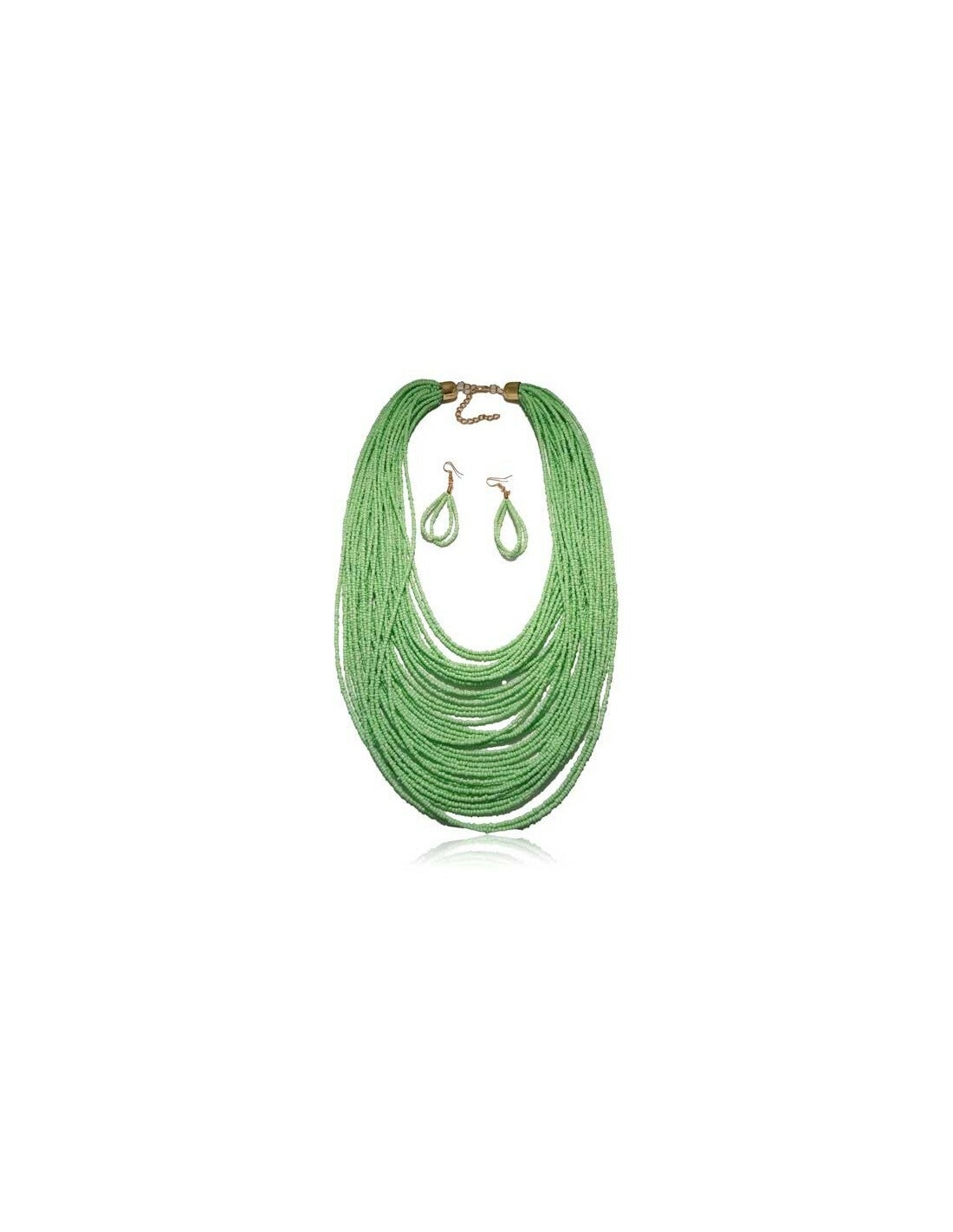 Parure perles de rocailles vert pastel multirangs, longueur du collier 66 cm, boucles d'oreilles 6 cm