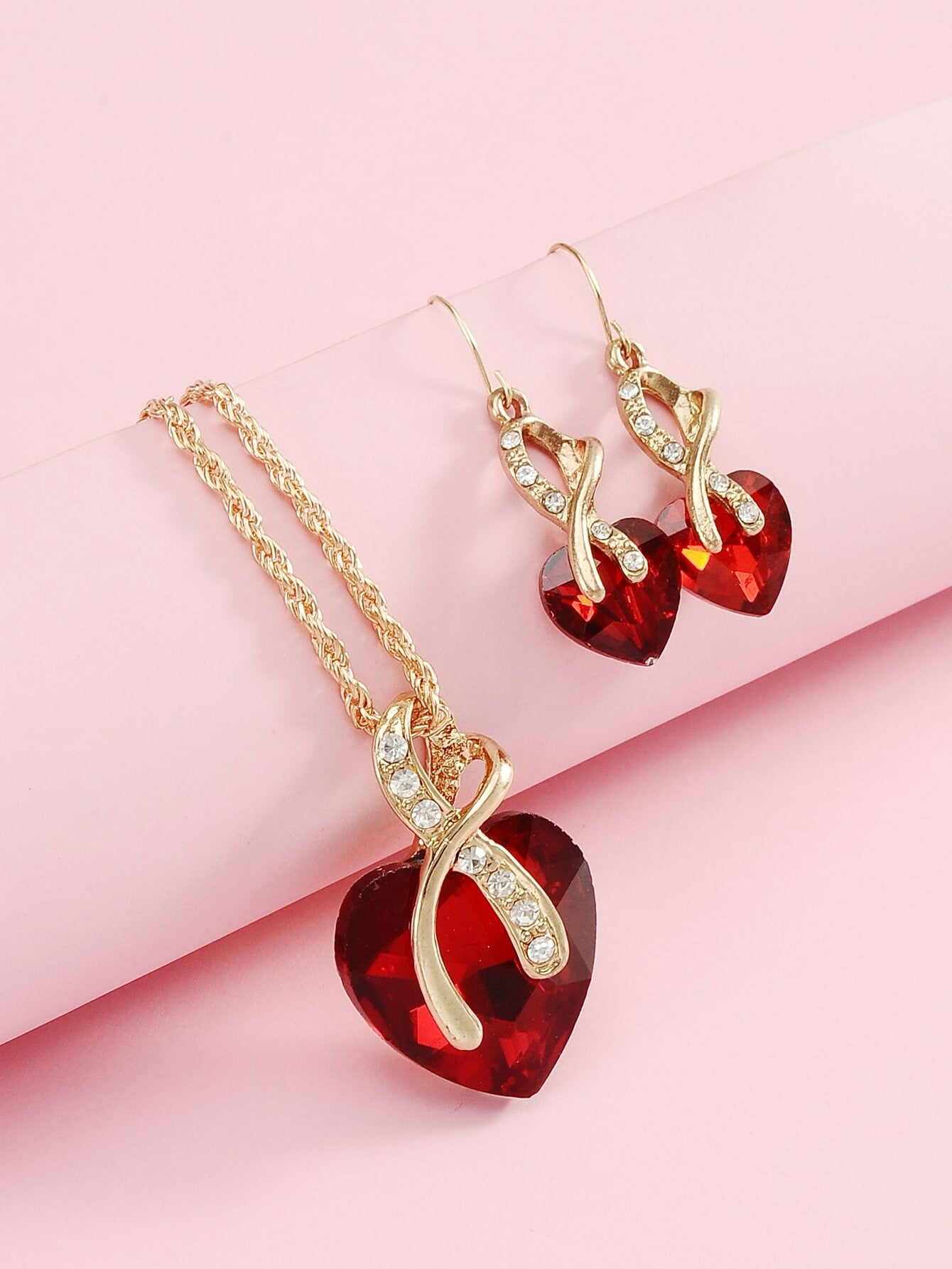 Parure de bijoux à cœur rouge - en cristal de gemme Strass Doré