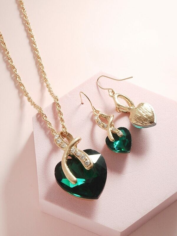 Parure de bijoux à cœur vert - en cristal de gemme Strass Doré