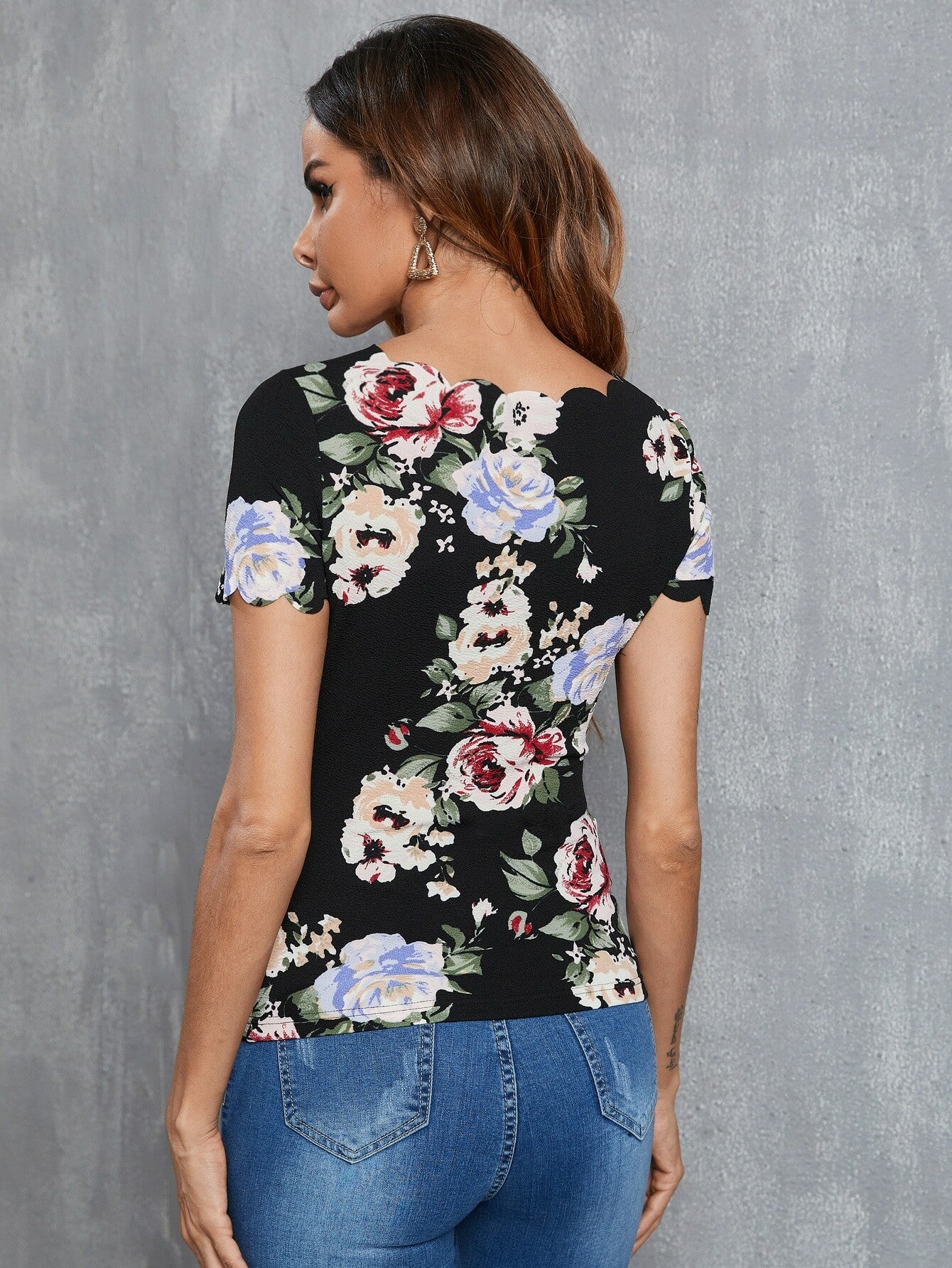 Body floral festonné imprimé 95% Polyester, 5% Élasthanne, Extensibilité légère Multicolore & Style Casual