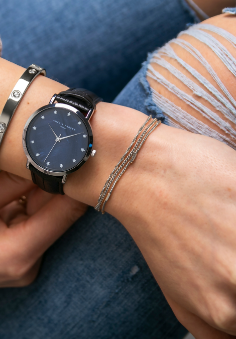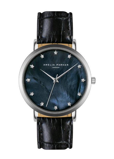 Montre à quartz en cuir, nacre et en acier - Noir et argenté - Marque Amelia Parker.