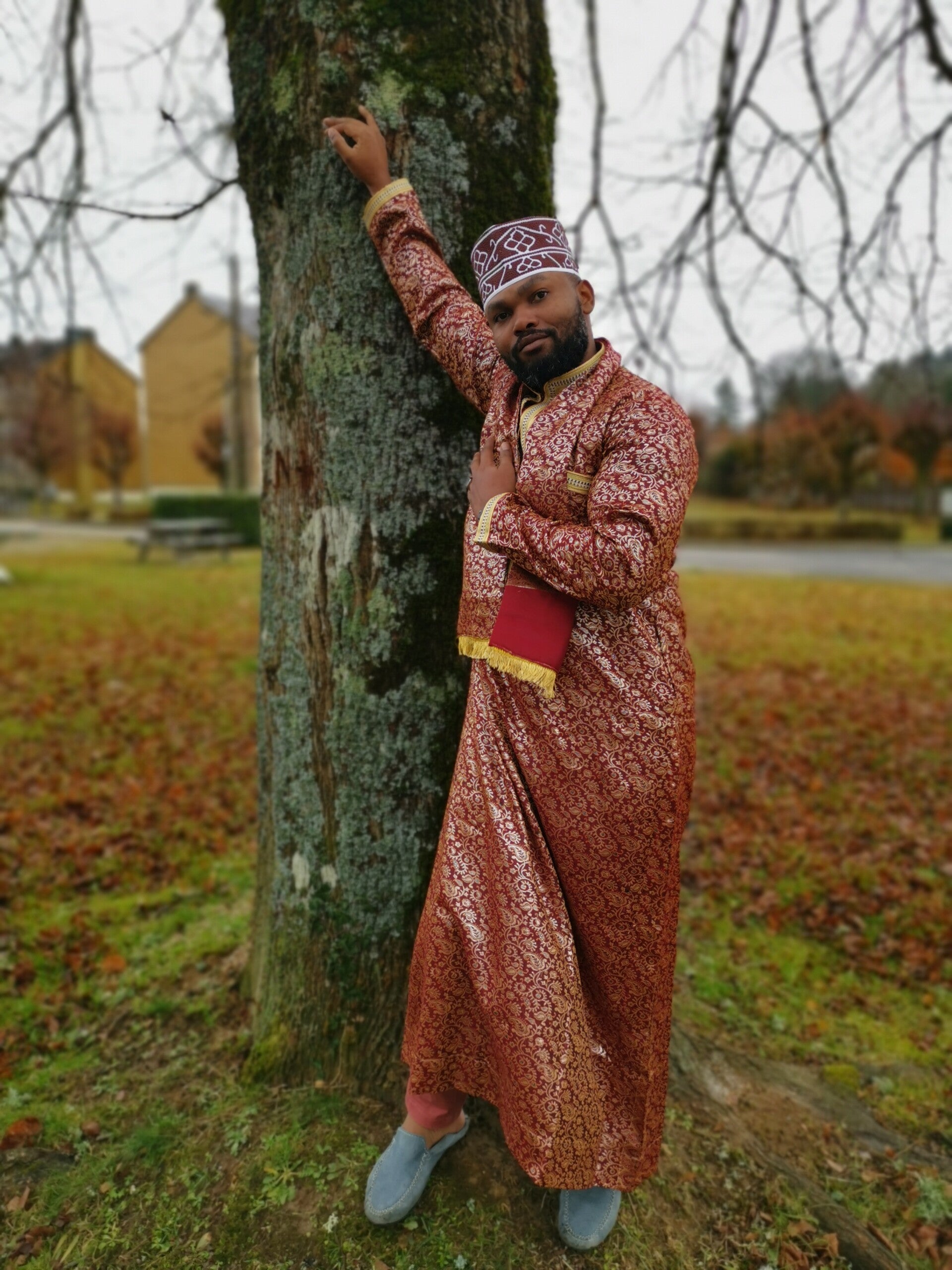 Ensemble de Kandzou et son Châle de couleur Rouge Bordeaux - Brodé de fils d'Or - Superbe tenue traditionnelle pour homme, très classe et sobre - Idéal pour cérémonie traditionnelle - Fait main.