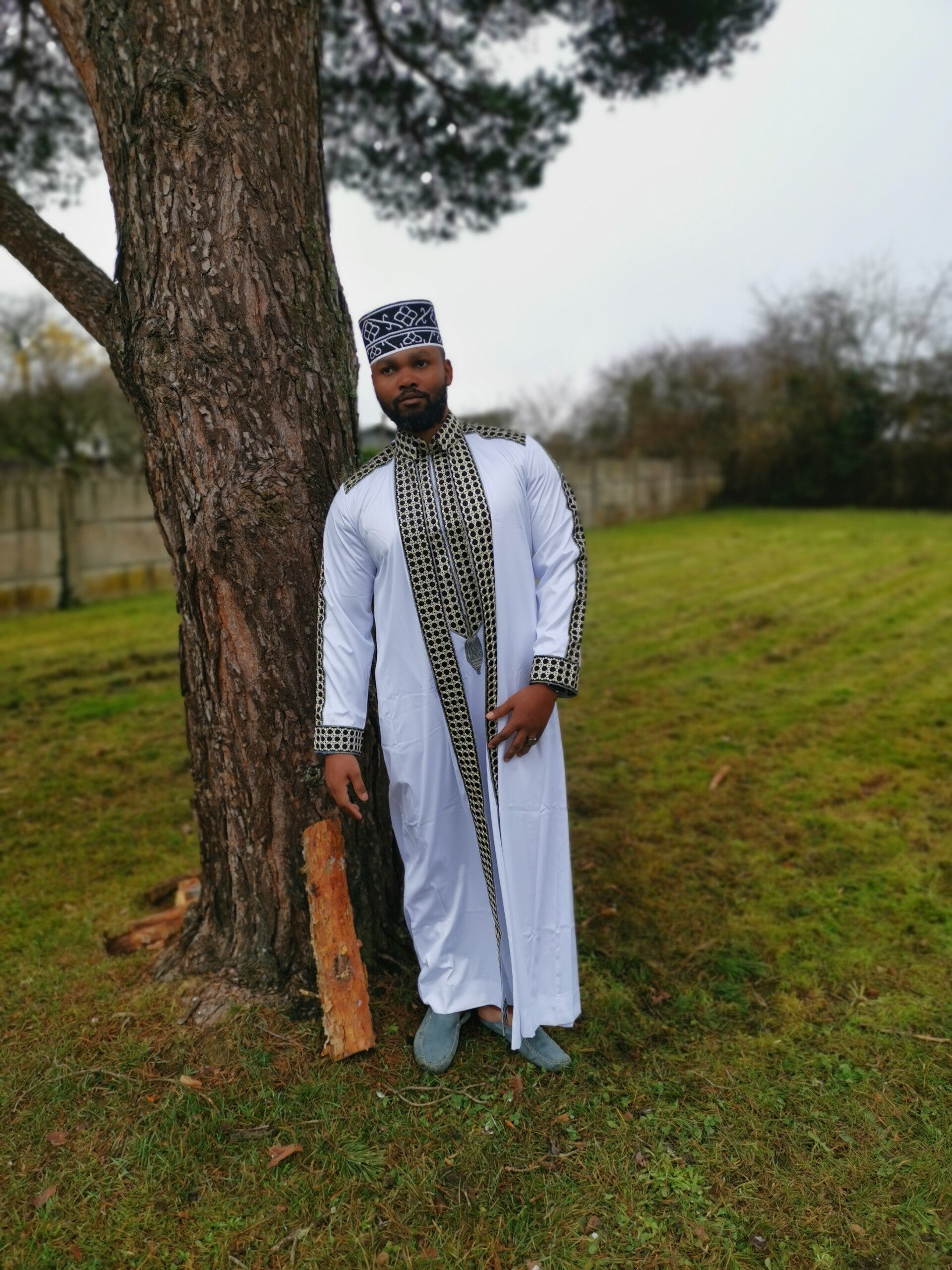 Ensemble Kandzou & Caftan Dhouba de couleur Blanc & Noir - Brodé de fils d'Or - Superbe tenue traditionnelle pour homme, très classe et sobre - Idéal pour cérémonie traditionnelle - Fait main.